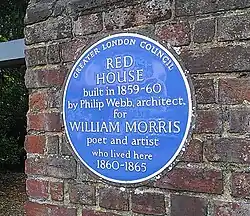 Morris desired a new home for himself and his family resulting in the construction of the Red House in the Kentish hamlet of Upton near Bexleyheath, ten miles from central London. The building's design was a co-operative effort, with Morris focusing on the interiors and the exterior being designed by Webb, for whom the House represented his first commission as an independent architect.[56] Named after the red bricks and red tiles from which it was constructed, Red House rejected architectural norms by being L-shaped.[57] Influenced by various forms of contemporary Neo-Gothic architecture, the House was nevertheless unique,[58] with Morris describing it as "very mediaeval in spirit".[59] Situated within an orchard, the house and garden were intricately linked in their design.[60] It took a year to construct,[61] and cost Morris £4000 at a time when his fortune was greatly reduced by a dramatic fall in the price of his shares.[62] Burne-Jones described it as "the beautifullest place on Earth."[63]
