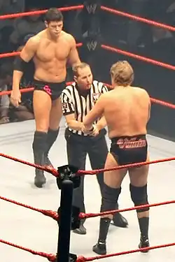 Regal is admonished by the referee following a typical heel action while wrestling Cody Rhodes