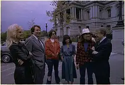Meanwhile, two collaborations with Waylon Jennings were released: WWII in 1982,[75] and Take it to the Limit in 1983. In the mid-1980s, Nelson, Jennings, Kristofferson, and Johnny Cash formed The Highwaymen, a supergroup who achieved platinum record sales and toured the world.[76] Meanwhile, Nelson became more involved with charity work, such as singing on "We Are the World" in 1984.[77] In 1985, Nelson had another success with Half Nelson, a compilation album of duets with a range of artists such as Ray Charles and Neil Young.[78] In 1980, Nelson performed on the south lawn of the White House. The concert of September 13 featured First Lady Rosalynn Carter and Nelson in a duet of Ray Wylie Hubbard's "Up Against the Wall Redneck Mother". Nelson frequently visited the White House, where, according to the biography by Joe Nick Patoski, Willie Nelson: An Epic Life, he smoked marijuana on the White House roof.[79]