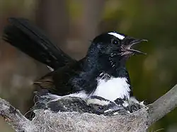 Although the willie wagtail is an aggressive defender of its nest, predators do account for many eggs and young. About two thirds of eggs hatch successfully, and a third leave the nest as fledglings. Nestlings may be preyed upon by both pied butcherbirds, (Cracticus nigrogularis) black butcherbirds (C. quoyi), the spangled drongo (Dicrurus bracteatus), and the pied currawong (Strepera graculina), as well as the feral cat (Felis catus), and rat species. The proximity of nesting to human habitation has also left nests open to destruction by children.[48] Mostly male willie wagtails sing at night only during breeding season. The song rate increases with lunar illumination.[49][50]