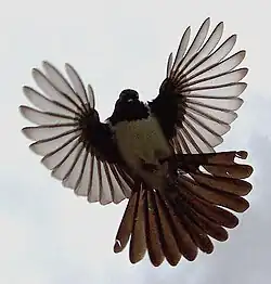 The willie wagtail is insectivorous and spends much time chasing prey in open habitat. Its common name is derived from its habit of wagging its tail horizontally when foraging on the ground. Aggressive and territorial, the willie wagtail will often harass much larger birds such as the laughing kookaburra and wedge-tailed eagle. It has responded well to human alteration of the landscape and is a common sight in urban lawns, parks, and gardens. It is widely featured in Aboriginal folklore around Australia and New Guinea in a variety of roles, from stealer of secrets and liar to a good omen for successful crops.[2][3][4]