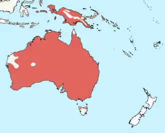 Widespread and abundant, the willie wagtail is found across most of Australia and New Guinea, the Solomon Islands, the Bismarck Archipelago, and eastern Indonesia. It is sedentary across most of Australia. Some areas have recorded seasonal movements; it is an autumn and winter visitor to northeastern New South Wales and southeast Queensland, and the Gulf Country and parts of Cape York Peninsula in the far north. It is a vagrant to Tasmania,[34] and on occasion reaches Lord Howe Island.[35] There is one record from Mangere Island in the Chatham Islands archipelago east of New Zealand in 2002.[36] The willie wagtail was released in Hawaii around 1922 to control insects on livestock, but the introduction was unsuccessful and the last sighting was at Koko Head in 1937.[37]