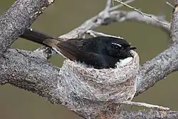 Willie wagtails usually pair for life. The breeding season lasts from July to December, more often occurring after rain in drier regions. Anywhere up to four broods may be raised during this time. It builds a cup-like nest on a tree branch away from leaves or cover, less than 5 m (16 ft) above the ground. Rafters and eaves may also be used. It has been observed to build its nest in the vicinity of those of the magpie-lark (Grallina cyanoleuca), possibly taking advantage of the latter bird's territoriality and aggression toward intruders. Similarly, it is not afraid to build near human habitation.[3]