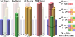 Some floors were designed with smaller footprints to attract prospective lessees, so the building's height was increased to meet Sears's floor-area requirements.[19] Architect Bruce Graham and structural engineer Fazlur Rahman Khan, both of whom were partners with SOM, proposed a tower with 55,000-square-foot (5,100 m2) floors in the lower part of the building, as well as a series of setbacks with gradually tapering floor plates, giving the tower its distinctive look.[20] During the design process, one of the architects reportedly pulled out nine cigars and staggered them vertically until the pair both agreed to the arrangement.[20][21] This allowed Sears to occupy the large lower stories, while providing more conventional office space that could be rented out on the upper stories.[22] The firm of Saphier, Lerner, Schindler was responsible for determining Sears's space requirements and designing furniture for the company.[15][23] It conducted a year-long study to determine how 16 of the company's departments should be laid out within the building.[23]