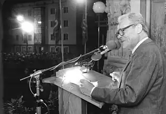 The diplomatic snub strained relations between Kennedy and Adenauer further during an especially tense time for Berlin.[26] However, following the building of the Berlin Wall in August 1961, Brandt was disappointed and angry with Kennedy. Speaking in Berlin three days later, Brandt criticized Kennedy, asserting "Berlin expects more than words. It expects political action." He also wrote Kennedy a highly critical public letter in which he warned that the development was liable "to arouse doubts about the ability of the three Allied Powers to react and their determination" and he called the situation "a state of accomplished extortion".[27] Kennedy was furious, but managed to defuse the tension by sending his vice president, Lyndon B. Johnson, to Berlin.[28] In June 1963, Brandt figured prominently in the staging of Kennedy's triumphant visit to West Berlin.[29]
