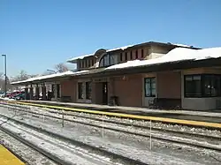 The Chicago and Milwaukee Railroad tracks were built in 1855,[6] facilitating the settlement of what would become the North Shore. Several large owners of land within the former reservation saw the opportunity to develop a community, and offered to build a station at their own expense if the railway would agree to stop in Wilmette[11] The offer was accepted, and in 1869, the Chicago and Milwaukee Railway (later the Chicago and North Western) began service to the station. The first station burned, but the second one had been finished by 1874 and is still in existence today.[6][11] This was a predecessor of today's Wilmette station.[6]