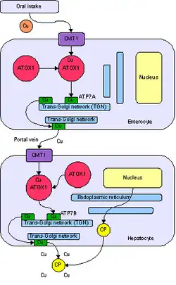 Copper enters the body through the digestive tract. A transporter protein on the cells of the small bowel, copper membrane transporter 1 (Ctr1; SLC31A1), carries copper inside the cells, where some is bound to metallothionein and part is carried by ATOX1 to an organelle known as the trans-Golgi network. Here, in response to rising concentrations of copper, an enzyme called ATP7A (Menkes' protein) releases copper into the portal vein to the liver. Liver cells also carry the CMT1 protein, and metallothionein and ATOX1 bind it inside the cell, but here, ATP7B links copper to ceruloplasmin and releases it into the bloodstream, as well as removing excess copper by secreting it into bile. Both functions of ATP7B are impaired in Wilson's disease. Copper accumulates in the liver tissue; ceruloplasmin is still secreted, but in a form that lacks copper (termed apo-ceruloplasmin) and is rapidly degraded in the bloodstream.[16]