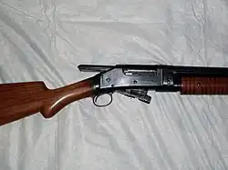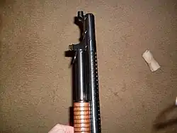 The Winchester Model 1897 and the Winchester Model 1893 were both designed by John Browning. The Model 1897 is an external hammer shotgun that is lacking a trigger disconnector. This means that the user can hold the trigger down while cycling the shotgun and once the action is returned to battery the shotgun fires.[12] The firearm itself is classified as a slide action pump shotgun. It was the first truly successful pump-action shotgun produced. Throughout the time period the Model 1897 was in production, over a million of the type were produced in various grades and barrel lengths. 16-gauge guns had a standard barrel length of 28 in (71 cm), while 12-gauge guns were furnished with 30 in (76 cm) length barrels. Special length barrels could be ordered in lengths as short as 20 in (51 cm), and as long as 36 in (91 cm). Along with various grades and barrel lengths, the Model 1897 came in two different chamberings. One was the 12 gauge and the other was the 16 gauge.[12] The shells should be of the 2+5⁄8 inch or 2+3⁄4 inch models.[7] Any shells larger are not recommended. An average Model 1897 can hold 5 or 6 shotgun shells in the magazine tube.[13] When working the action of the Model 1897 the forend (fore grip) is pulled back, forcing the breech bolt to the rear which extracts and then ejects the spent shell while simultaneously cocking the external hammer by pushing it to the rear. When the forend is slid forward again, the breech bolt pushes a fresh shell into the gun's chamber and locks into place.