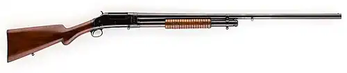 The Winchester Model 1897, also known as the Model 97, M97, Riot Gun, or Trench Gun, is a pump-action shotgun with an external hammer and tube magazine manufactured by the Winchester Repeating Arms Company. The Model 1897 was an evolution of the Winchester Model 1893 designed by John Browning. From 1897 until 1957, over one million of these shotguns were produced. The Model 1897 was offered in numerous barrel lengths and grades, chambered in 12 and 16 gauge, and as a solid frame or takedown. The 16-gauge guns had a standard barrel length of 28 in (71 cm), while 12-gauge guns were furnished with 30 in (76 cm) barrels. Special length barrels could be ordered in lengths as short as 20 in (51 cm) or as long as 36 in (91 cm). Since the time the Model 1897 was first manufactured, it has been used to great effect by American military personnel,[3] law enforcement officers,[4][5] and hunters.[5]