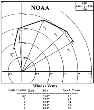 Sound movement through the atmosphere is affected by wind shear, which can bend the wave front, causing sounds to be heard where they normally would not, or vice versa.[70] Strong vertical wind shear within the troposphere also inhibits tropical cyclone development,[71] but helps to organize individual thunderstorms into living longer life cycles that can then produce severe weather.[72] The thermal wind concept explains how differences in wind speed with height are dependent on horizontal temperature differences, and explains the existence of the jet stream.[73]