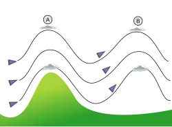 Over elevated surfaces, heating of the ground exceeds the heating of the surrounding air at the same altitude above sea level, creating an associated thermal low over the terrain and enhancing any thermal lows that would have otherwise existed,[50][51] and changing the wind circulation of the region. In areas where there is rugged topography that significantly interrupts the environmental wind flow, the wind circulation between mountains and valleys is the most important contributor to the prevailing winds. Hills and valleys substantially distort the airflow by increasing friction between the atmosphere and landmass by acting as a physical block to the flow, deflecting the wind parallel to the range just upstream of the topography, which is known as a barrier jet. This barrier jet can increase the low-level wind by 45%.[52] Wind direction also changes because of the contour of the land.[53]