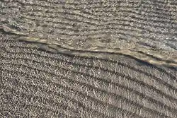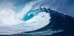 In fluid dynamics, a wind wave, or wind-generated water wave, is a surface wave that occurs on the free surface of bodies of water as a result of the wind blowing over the water's surface. The contact distance in the direction of the wind is known as the fetch. Waves in the oceans can travel thousands of kilometers before reaching land. Wind waves on Earth range in size from small ripples to waves over 30 m (100 ft) high, being limited by wind speed, duration, fetch, and water depth.[1]