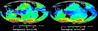 The image shows the global distribution of wind speed and wave height as observed by NASA's TOPEX/Poseidon's dual-frequency radar altimeter from October 3 to October 12, 1992. Simultaneous observations of wind speed and wave height are helping scientists to predict ocean waves. Wind speed is determined by the strength of the radar signal after it has bounced off the ocean surface and returned to the satellite. A calm sea serves as a good reflector and returns a strong signal; a rough sea tends to scatter the signals and returns a weak pulse. Wave height is determined by the shape of the return radar pulse. A calm sea with low waves returns a condensed pulse whereas a rough sea with high waves returns a stretched pulse. Comparing the two images above shows a high degree of correlation between wind speed and wave height. The strongest winds (33.6 mph; 54.1 km/h) and highest waves are found in the Southern Ocean. The weakest winds — shown as areas of magenta and dark blue — are generally found in the tropical oceans.
