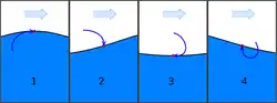 The phases of an ocean surface wave: 1. Wave Crest, where the water masses of the surface layer are moving horizontally in the same direction as the propagating wavefront. 2. Falling wave. 3. Trough, where the water masses of the surface layer are moving horizontally in the opposite direction of the wavefront direction. 4. Rising wave.