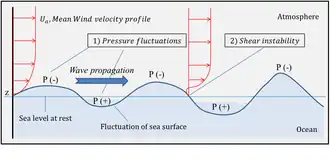 2. The winds keep acting on the initially rippled sea surface causing the waves to become larger. As the waves grow, the pressure differences get larger causing the growth rate to increase. Finally, the shear instability expedites the wave growth exponentially. (The Miles mechanism[8])