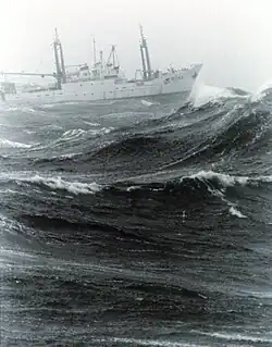 The largest ever recorded wind waves are not rogue waves, but standard waves in extreme sea states. For example, 29.1 m (95 ft) high waves were recorded aboard the RRS Discovery, in a sea with 18.5 m (61 ft) significant wave height, so the highest wave was only 1.6 times the significant wave height.[14] The biggest recorded by a buoy (as of 2011) was 32.3 m (106 ft) high during the 2007 typhoon Krosa near Taiwan.[15]
