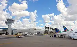 Eros Airport is the busiest airport in Namibia in terms of takeoffs and landings.[27] This city airport handles approximately 150 to 200 movements per day, amounting to roughly 50,000 per year. In 2004, the airport served 141,605 passengers, the majority of which are light aircraft. Primarily, limitations such as runway length, noise, and air space congestion have kept Eros from developing into a larger airport. Most of Namibia's charter operators have Eros as their base.