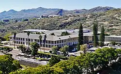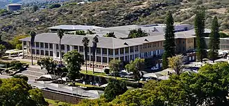 The city is the administrative, commercial, and industrial centre of Namibia. A 1992/93 study estimated that Windhoek provides over half of Namibia's non-agricultural employment, with its national share of employment in utilities being 96%, in transport and communication 94%, finance and business services 82%.[20] Due to its relative size[21] Windhoek is, even more than many other national capital cities, the social, economic, and cultural centre of the country. The University of Namibia is based in the city, as well as nearly every national enterprise, including the country's only theatre, all ministry head offices, and all major media and financial entities.[22] The governmental budget of the city of Windhoek nearly equals those of all other Namibian local authorities combined.[23] Of the 3,300 US$-millionaires in Namibia, 1,400 live in Windhoek.[24]