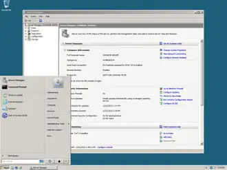 Server Manager is a new roles-based management tool for Windows Server 2008.[29] It is a combination of Manage Your Server and Security Configuration Wizard from Windows Server 2003. Server Manager is an improvement of the Configure my server dialog that launches by default on Windows Server 2003 machines. However, rather than serve only as a starting point to configuring new roles, Server Manager gathers together all of the operations users would want to conduct on the server, such as, getting a remote deployment method set up, adding more server roles etc., and provides a consolidated, portal-like view about the status of each role.[30]
