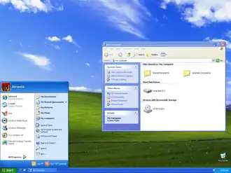 ![]() Screenshot of Windows XP running the Luna visual style, showing the start menu, taskbar, and My Computer window | |