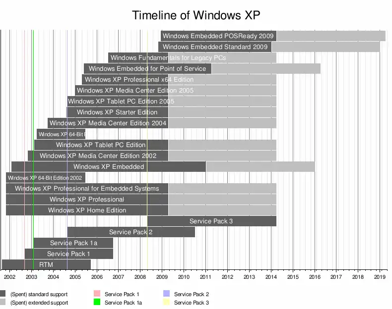 Mainstream support for Windows XP ended on April 14, 2009, and extended support ended on April 8, 2014. Windows Embedded POSReady 2009, based on Windows XP Professional, received security updates until April 2019. The final security update for Service Pack 3 was released on May 14, 2019. Unofficial methods were made available to apply the updates to other editions of Windows XP. Microsoft has discouraged this practice, citing compatibility issues.[5]