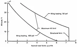 As stalling is due to wing loading and maximum lift coefficient at a given altitude and speed, this limits the turning radius due to maximum load factor. At Mach 0.85 and 0.7 lift coefficient, a wing loading of 50 lb/sq ft (240 kg/m2) can reach a structural limit of 7.33g up to 15,000 feet (4,600 m) and then decreases to 2.3g at 40,000 feet (12,000 m). With a wing loading of 100 lb/sq ft (490 kg/m2) the load factor is twice smaller and barely reaches 1g at 40,000 ft (12,000 m).[15]