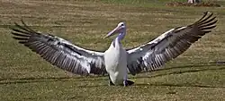 To measure the wingspan of a bird, a live or freshly-dead specimen is placed flat on its back, the wings are grasped at the wrist joints and the distance is measured between the tips of the longest primary feathers on each wing.[3]
