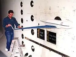 In 1987, mechanical engineer Peter Masak called on aerodynamicist Mark D. Maughmer, an associate professor of aerospace engineering at the Pennsylvania State University, about designing winglets to improve performance on his 15-meter (49 ft) wingspan racing sailplane. Others had attempted to apply Whitcomb's winglets to gliders before, and they did improve climb performance, but this did not offset the parasitic drag penalty in high-speed cruise. Masak was convinced it was possible to overcome this hurdle.[37] By trial and error, they ultimately developed successful winglet designs for gliding competitions, using a new PSU–90–125 airfoil, designed by Maughmer specifically for the winglet application. At the 1991 World Gliding Championships in Uvalde, Texas, the trophy for the highest speed went to a winglet-equipped 15-meter class limited wingspan glider, exceeding the highest speed in the unlimited span Open Class, an exceptional result.[38] Masak went on to win the 1993 U.S. 15 Meter Nationals gliding competition, using winglets on his prototype Masak Scimitar.[39]