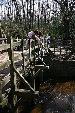The game of Poohsticks was originally played by Christopher Robin Milne and his father on the wooden footbridge,[24] across the Millbrook,[25] Posingford Wood, close to Cotchford Farm. In the stories Pooh plays the game with the other characters, Christopher Robin, Tigger, and Eeyore.[26] The location is now a tourist attraction, and it has become traditional to play the game there using sticks gathered in the nearby woodland.[24][27] When the footbridge had to be replaced in 1999, the architect used as a main source drawings by Shepard in the books, and retained its precursor's original style.[28]