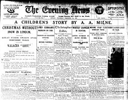 Christopher Robin's teddy bear made his character début, under the name Edward, in A. A. Milne's poem, "Teddy Bear", in the edition of 13 February 1924 of Punch (E. H. Shepard had also included a similar bear in a cartoon published in Punch the previous week[29]), and the same poem was published in Milne's book of children's verse When We Were Very Young (6 November 1924).[30] Winnie-the-Pooh first appeared by name on 24 December 1925, in a Christmas story commissioned and published by the London newspaper Evening News. It was illustrated by J. H. Dowd.[31]