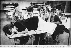 Ryder next starred in the independent film Heathers (1989). The film, a satirical take on teenage life, featured Ryder and Christian Slater as high school sweethearts who begin killing off popular students. Her agent initially begged her to turn the role down, saying the film would "ruin her career".[17] Critical reaction to the film was largely positive,[30] and Ryder's performance was positively received, with The Washington Post calling Ryder "Hollywood's most impressive ingénue [...] Ryder [...] makes us love her teen-age murderess, a bright, funny girl with a little Bonnie Parker in her. She is the most likable, best-drawn young adult protagonist since the sexual innocent of Gregory's Girl."[31] Despite its critical success, Heathers was a box-office flop, but has achieved the status of a cult film in following decades.[32] However, soon after the film's release, Ryder had an offer to co-star in the 1990 film The Freshman rescinded because the production team was offended by the film's controversial subject matter.[33] Later that year, she starred in the 1989 biopic Great Balls of Fire!, in which she played the 13-year-old bride (and cousin) of rock'n'roll idol Jerry Lee Lewis. The film was a box-office failure and received mixed reviews from critics.[34] Ryder also appeared in 1989 in the music video for Mojo Nixon's "Debbie Gibson Is Pregnant with My Two-Headed Love Child".[35]
