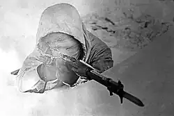 The winter of 1939–40 was exceptionally cold with the Karelian Isthmus experiencing a record low temperature of −43 °C (−45 °F) on 16 January 1940.[151] At the beginning of the war, only those Finnish soldiers who were in active service had uniforms and weapons. The rest had to make do with their own clothing, which for many soldiers was their normal winter clothing with a semblance of insignia added. Finnish soldiers were skilled in cross-country skiing.[152] The cold, snow, forest, and long hours of darkness were factors that the Finns could use to their advantage. The Finns dressed in layers, and the ski troopers wore a lightweight white snow cape. This snow-camouflage made the ski troopers almost invisible so that they could more easily execute guerrilla attacks against Soviet columns. At the beginning of the war, Soviet tanks were painted in standard olive drab and men dressed in regular khaki uniforms. Not until late January 1940 did the Soviets paint their equipment white and issue snowsuits to their infantry.[153]