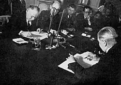 On the next meeting on 23 October, Stalin lessened his demands: a reduction in the amount of land demanded in Karelia; a reduction of the Hanko garrison from 5000 to 4000 men; and reducing the length of lease from 30 years to whatever date the ongoing (second world) war in Europe would end.[76] However, this sudden change, contrary to previous statements that Soviet demands were minimalist and thus unalterable, had surprised the Finnish government, and lead them to believe more concession may be forthcoming. Thus, Paasikivi's idea of reaching some sort of compromise by offering the Soviets the island of Jussarö and the fort of Ino were refused by Helsinki.[77]
