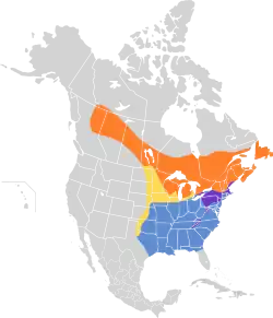 It breeds in coniferous forests from British Columbia to the Atlantic Ocean. It migrates through and winters across southeastern Canada, the eastern half the United States and (rarely) north-eastern Mexico. Small numbers may be casual in the western United States and Canada.