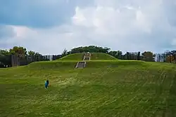 Wisconsin has been home to a wide variety of cultures over the past 14,000 years. The first people arrived around 10,000 BCE during the Wisconsin Glaciation. These early inhabitants, called Paleo-Indians, hunted now-extinct ice age animals such as the Boaz mastodon, a prehistoric mastodon skeleton unearthed along with spear points in southwest Wisconsin.[32] After the ice age ended around 8000 BCE, people in the subsequent Archaic period lived by hunting, fishing, and gathering food from wild plants. Agricultural societies emerged gradually over the Woodland period between 1000 BCE to 1000 CE. Toward the end of this period, Wisconsin was the heartland of the "Effigy Mound culture", which built thousands of animal-shaped mounds across the landscape.[33] Later, between 1000 and 1500 CE, the Mississippian and Oneota cultures built substantial settlements including the fortified village at Aztalan in southeast Wisconsin.[34] The Oneota may be the ancestors of the modern Iowa and Ho-Chunk nations who shared the Wisconsin region with the Menominee at the time of European contact.[35] Other Native American groups living in Wisconsin when Europeans first settled included the Ojibwe, Sauk, Meskwaki, Kickapoo, and Potawatomi, who migrated to Wisconsin from the east between 1500 and 1700.[36]