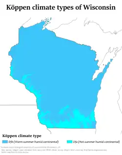 Most of Wisconsin is classified as warm-summer humid continental climate (Köppen Dfb), while southern and southwestern portions are classified as hot-summer humid continental climate (Köppen Dfa). The highest temperature ever recorded in the state was in the Wisconsin Dells, on July 13, 1936, where it reached 114 °F (46 °C). The lowest temperature ever recorded in Wisconsin was in the village of Couderay, where it reached −55 °F (−48 °C) on both February 2 and 4, 1996. Wisconsin also receives a large amount of regular snowfall averaging around 40 inches (100 cm) in the southern portions with up to 160 inches (410 cm) annually in the Lake Superior snowbelt each year.[97]