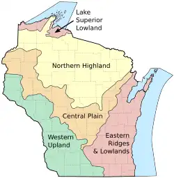 Lying between the Great Lakes and the Mississippi River, Wisconsin has a wide variety of geographical features. The state is divided into five distinct regions. In the north, the Lake Superior Lowland occupies a belt of land along Lake Superior. Just to the south, the Northern Highland has massive mixed hardwood and coniferous forests including the 1,500,000-acre (610,000-hectare) Chequamegon–Nicolet National Forest, as well as thousands of glacial lakes, and the state's highest point, Timms Hill. In the middle of the state, the Central Plain has some unique sandstone formations like the Dells of the Wisconsin River in addition to rich farmland. The Eastern Ridges and Lowlands region in the southeast is home to many of Wisconsin's largest cities. The ridges include the Niagara Escarpment that stretches from New York, the Black River Escarpment and the Magnesian Escarpment.[85][86] In the southwest, the Western Upland is a rugged landscape with a mix of forest and farmland, including many bluffs on the Mississippi River, and the Baraboo Range. This region is part of the Driftless Area, which also includes parts of Iowa, Illinois, and Minnesota. Overall, 46% of Wisconsin's land area is covered by forest.