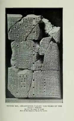 The Maqlû ("burning") is an ancient Akkadian text written early in the first millennium BCE, which sets out a Mesopotamian anti-witchcraft ritual.[94] This lengthy ritual includes invoking various gods, burning an effigy of the witch, then dousing and disposing of the remains.[95]