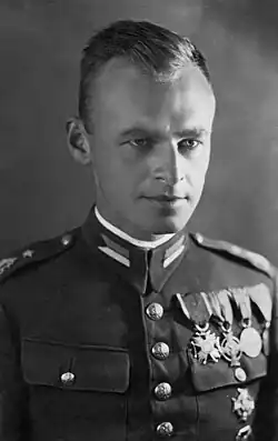 By the conclusion of Polish-Soviet War in March 1921, Pilecki was promoted to the rank of plutonowy (corporal), becoming a non-commissioned officer.[10]: 19 Shortly afterward, Pilecki was transferred to the army reserves, completing courses required for a non-commissioned officer rank at the Cavalry Reserve Officers' Training School in Grudziądz.[6] He went on to complete his secondary education (matura) later that same year.[1] He briefly enrolled with the Faculty of Fine Arts at Stefan Batory University but was forced to abandon his studies in 1924 due to both financial issues and the declining health of his father.[6] In July 1925, Pilecki was assigned to the 26th Lancer Regiment with the rank of Chorąży (ensign). Pilecki would be promoted to podporucznik (second lieutenant, with seniority from 1923) the following year.[9][6] Also in September 1926, Pilecki became the owner of his family's ancestral estate, Sukurcze, in the Lida District of the Nowogródek Voivodeship. In 1931, he married Maria Ostrowska. They had two children, born in Vilnius over the next two years: Andrzej and Zofia. Pilecki actively supported the local farming community. He was also an amateur poet and painter. He organized the Krakus Military Horsemen Training program in 1932 and was appointed to command the 1st Lida Military Training Squadron, which in 1937 was placed under the Polish 19th Infantry Division. In 1938, Pilecki received the Silver Cross of Merit for his activities.[11][9][6]