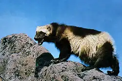 Wolves, American black bears, brown bears and cougars are capable of killing adult wolverines, while smaller predators (like golden eagles) can kill young and inexperienced individuals.[62] Wolves are thought to be the wolverine's most important natural predator, with the arrival of wolves to a wolverine's territory presumably leading the latter to abandon the area.[63] Armed with powerful jaws, sharp claws, and a thick hide,[64] wolverines, like most mustelids, are remarkably strong for their size. They may defend against larger or more numerous predators such as wolves or bears.[65] By far, their most serious predator is the grey wolf, with an extensive record of wolverine fatalities attributed to wolves in both North America and Eurasia.[66][67][68][69] In North America, another (less frequent) predator is the cougar.[70] At least one account reported a wolverine's apparent attempt to steal a kill from a black bear, although the bear won what was ultimately a fatal contest for the wolverine.[71] There are a few accounts of brown bears killing and consuming wolverines as well and, although also reported at times to be chased off prey, in some areas such as Denali National Park, wolverines seemed to try to actively avoid encounters with grizzly bears as they have been reported in areas where wolves start hunting them.[72][73]