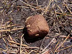 Wombats leave distinctive cube-shaped faeces.[9] As wombats arrange these feces to mark territories and attract mates, it is believed that the cubic shape makes them more stackable and less likely to roll, which gives this shape a biological advantage. The method by which the wombat produces them is not well understood, but it is believed that the wombat intestine stretches preferentially at the walls, with two flexible and two stiff areas around its intestines.[10] The adult wombat produces between 80 and 100, 2 cm (0.8 in) pieces of feces in a single night, and four to eight pieces each bowel movement.[11][12] In 2019 the production of cube-shaped wombat feces was the subject of the Ig Nobel Prize for Physics, won by Patricia Yang and David Hu.[13][14]