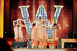 On April 5, 2010, the Wonder Girls announced a 20-show tour of the US and Canada in conjunction with Live Nation, "The Wonder World Tour", which included label mates 2PM for nine dates.[37] The tour consisted of a combination of the English and Korean versions of their songs alongside covers of popular English-language songs.[38] The first leg of the tour began in Washington, D.C., on June 4, 2010. The tour was eventually extended to add an additional leg in which label mates 2AM opened for the group during several dates.[39]