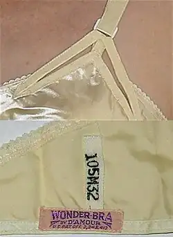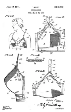 Elastic materials were rationed and unavailable for clothes prior to the start of World War II. Israel Pilot designed an improved cup with a diagonal slash, shoulder strap attachment. This innovation on existing bra design provided more comfort and freedom of movement for the wearer.[4] He also coined the name "Wonder-Bra" in 1935.[5]