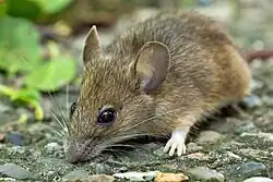 The wood mouse (Apodemus sylvaticus) is a murid rodent native to Europe and northwestern Africa. It is closely related to the yellow-necked mouse (A. flavicollis) but differs in that it has no band of yellow fur around the neck, has slightly smaller ears, and is usually slightly smaller overall: around 90 mm (3.54 in) in length and 23 g in weight.[2] It is found across most of Europe and is a very common and widespread species, is commensal with people and is sometimes considered a pest.[1] Other common names are long-tailed field mouse, field mouse, common field mouse, and European wood mouse.[3] This species is a known potential carrier of the Dobrava sequence of hantavirus which affects humans and may pose serious risks to human health.[4]