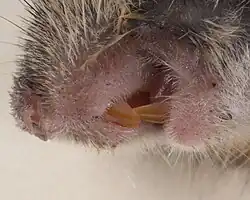 Wood mice are mainly active during the dark, probably having evolved so to avoid predation, employing several anti-predatory strategies, though breeding females may be more active in daylight in order to collect sufficient food.[10] While foraging, wood mice pick up and distribute visually conspicuous objects, such as leaves and twigs, which they then use as landmarks during exploration.[11][12] If a wood mouse is caught by its tail, it can quickly shed the end of it, which may never regrow.[13] Despite its name, it prefers hedgerows to woodland. During the colder months, wood mice do not hibernate; however, during severe winter seasons they can fall into a torpid state, a decrease in physiological activity.