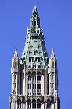 Strongly articulated piers, which carry right to the pyramidal cap without intermediate cornices, give the building its upward thrust.[59] This was influenced by Aus's belief that, "From an engineering point of view, no structure is beautiful where the lines of strength are not apparent."[12][60] The copper roof is connected to the Woolworth Building's steel superstructure, which serves to ground the roof electrically.[59] The Gothic detailing concentrated at the highly visible crown is over-scaled, and the building's silhouette could be made out from several miles away. Gilbert's choice of the Gothic style was described as "an expression of the verticality of the tower form", and as Gilbert himself later wrote, the style was "light, graceful, delicate and flame-like".[61] Gilbert considered several proposals for exterior lighting, including four powerful searchlights atop nearby buildings and a constantly rotating lamp at the apex of the Woolworth Building's roof. Ultimately, the builders decided to erect nitrogen lamps and reflectors above the 31st floor, and have the intensity of the lighting increase with height.[32]
