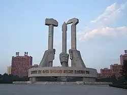 The WPK maintains a leftist image.[68] It normally sends a delegation to the International Meeting of Communist and Workers' Parties, where it has some support.[69] Its 2011 resolution, "Let us jointly commemorate the Birth Centenary of the Great Leader comrade President Kim Il Sung as a Grand Political Festival of the World's Humankind", was signed by 30 of the 79 attending parties.[70] The WPK also sees itself as part of the worldwide leftist and socialist movements; during the Cold War, the WPK and North Korea had a policy of "exporting revolution", aiding leftist guerrillas worldwide. Additionally, its party rules say its ultimate aim is to "realize a communist society in which the people's ideals are fully realized" and further state it upholds "the revolutionary principles of Marxism–Leninism".[6] Brian Reynolds Myers, Jasper Becker, and Dae-Sook Suh argue that the WPK's ideology is xenophobic, racist, and nationalist.[68][71][72]