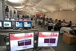 As many as 500 journalists from online, print, radio, and television take part, with access to all sessions in the official program, some of which are also webcast.[72] Not all the journalists are given access to all areas, however. This is reserved for white badge holders. "Davos runs an almost caste-like system of badges", according to BBC journalist Anthony Reuben. "A white badge means you're one of the delegates – you might be the chief executive of a company or the leader of a country (although that would also get you a little holographic sticker to add to your badge), or a senior journalist. An orange badge means you're just a run-of-the-mill working journalist."[73] Since 2024 the WEF launched a new badge system where Accredited Badges are issued. These badges have access to the Ice Village which is a smaller version of the official Congress Hall.[74] All plenary debates from the annual meeting also are available on YouTube[75] while photographs are available on Flickr.[76][77]