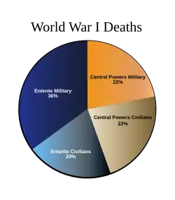 Casualty statistics for World War I vary to a great extent; estimates of total deaths range from nine million to over 15 million.[3] Military casualties reported in official sources list deaths due to all causes, including an estimated seven to eight million combat related deaths (killed or died of wounds) and another two to three million military deaths caused by accidents, disease and deaths while prisoners of war. Official government reports listing casualty statistics were published by the United States and Great Britain.[4][5] These secondary sources published during the 1920s, are the source of the statistics in reference works listing casualties in World War I.[6][7][8][9][10] This article summarizes the casualty statistics published in the official government reports of the United States and Great Britain as well as France, Italy, Belgium, Germany, Austria and Russia. More recently the research of the Commonwealth War Graves Commission (CWGC) has revised the military casualty statistics of the UK and its allies; they include in their listing of military war dead personnel outside of combat theaters and civilians recruited from Africa, the Middle East and China who provided logistical and service support in combat theaters.[11][12][13][14][15] The casualties of these support personnel recruited outside of Europe were previously not included with British war dead, however the casualties of the Labour Corps recruited from the British Isles were included in the rolls of British war dead published in 1921.[16] The methodology used by each nation to record and classify casualties was not uniform, a general caveat regarding casualty figures is that they cannot be considered comparable in all cases.[17] First World War civilian deaths are "hazardous to estimate" according to Micheal Clodfelter who maintains that "the generally accepted figure of noncombatant deaths is 6.5 million."[18]