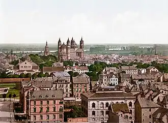 Worms was in ancient times a Celtic city named Borbetomagus, perhaps meaning "water meadow".[8] Later it was conquered by the Germanic Vangiones tribe. In 14 BC, Romans under the command of Drusus captured and fortified the city, and from that time onwards, a small troop of infantry and cavalry was garrisoned there. The Romans renamed the city as Augusta Vangionum, after the then-emperor and the local tribe. The name does not seem to have taken hold, however, and from Borbetomagus developed the German Worms and Latin Wormatia; as late as the modern period, the city name was written as Wormbs.[9] The garrison grew into a small town with a regular Roman street plan, a forum, and temples for the main gods Jupiter, Juno, Minerva (whose temple was the site of the later cathedral), and Mars.